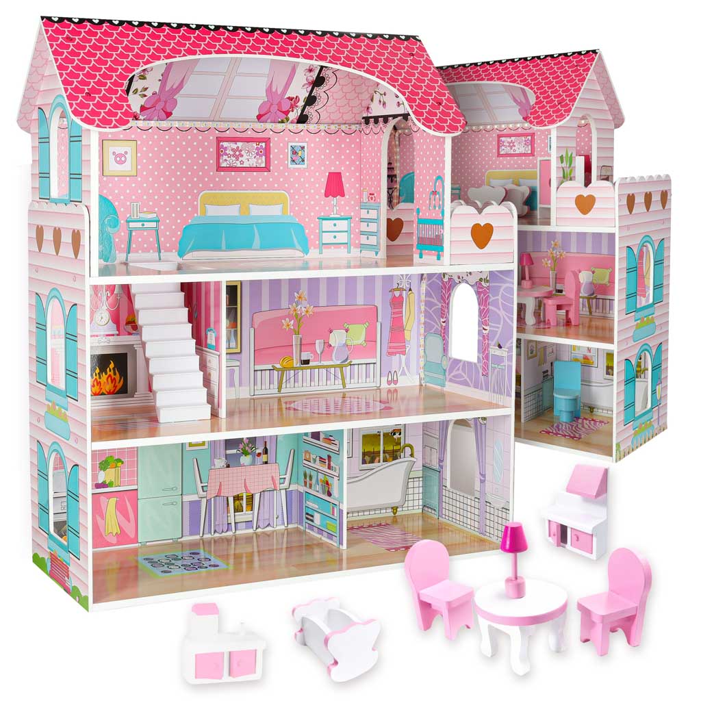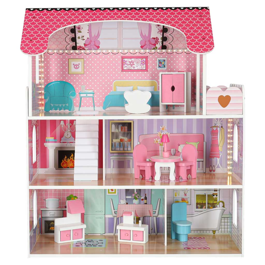 Căsuță de păpuși din lemn Lulilo cu 3 etaje, mobilier inclus și iluminare LED, 70cm, Roz